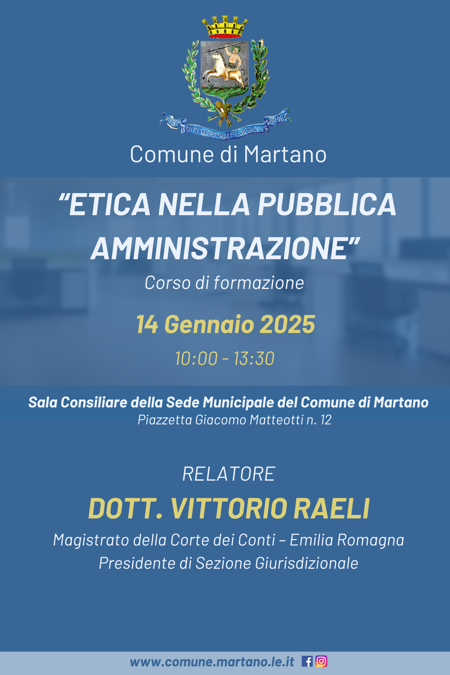 "Etica nella pubblica amministrazione" Corso di formazione. 14 Gennaio 2025 dalle ore 10:00 alle 13:30 presso la Sala Consiliare del Palazzo Municipale del Comune di Martano