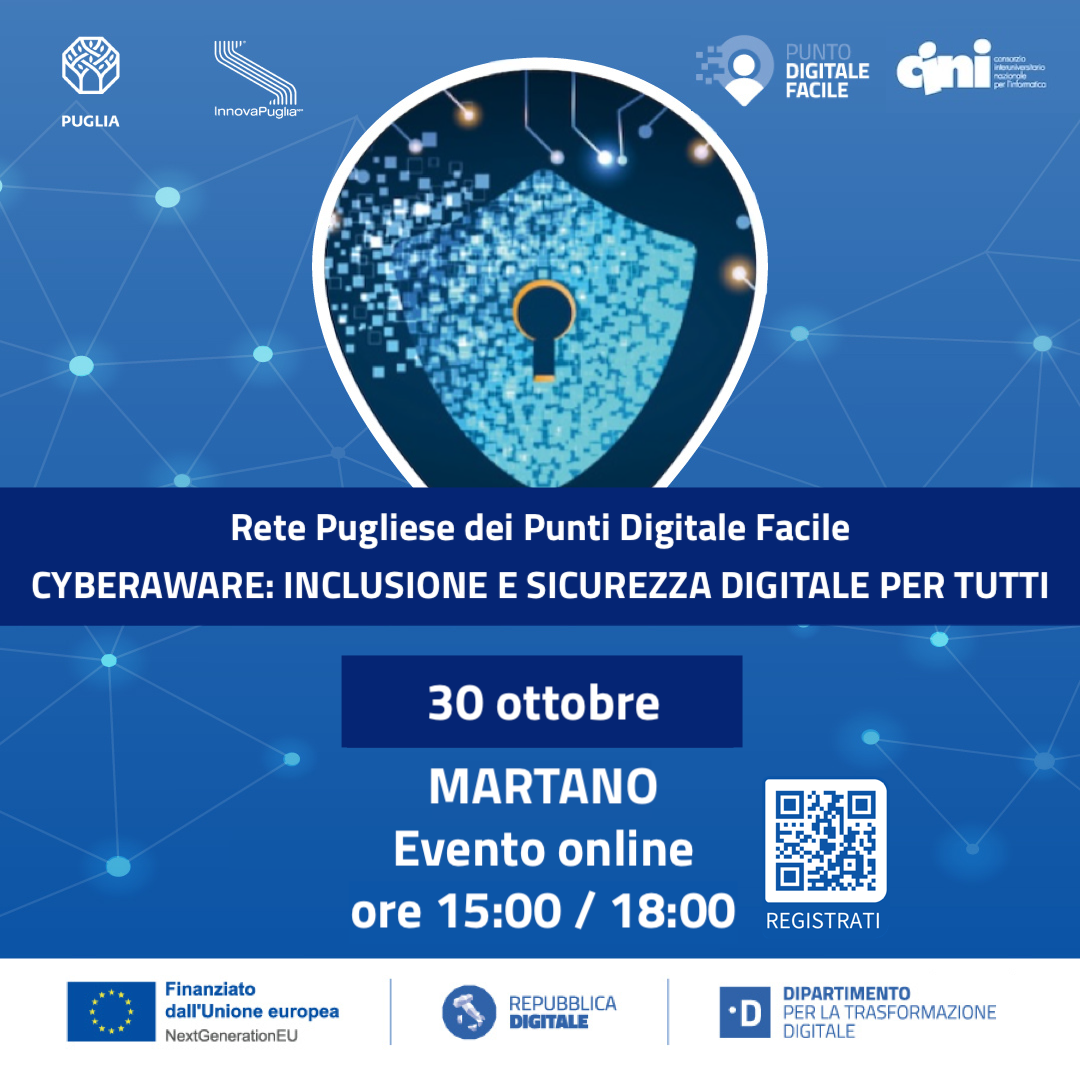 a puntodigitalefacile@innova.puglia.it. “CyberAware: Inclusione e Sicurezza Digitale per Tutti” è un iniziativa prevista nell'ambito del progetto “Rete dei servizi di facilitazione digitale” promosso dal Dipartimento Sviluppo Economico della Regione Puglia con la collaborazione di InnovaPuglia SpA, finanziato con le risorse del PNRR - Investimento 1.7.2, nell’ambito del progetto nazionale del Dipartimento per la Trasformazione Digitale (DTD).